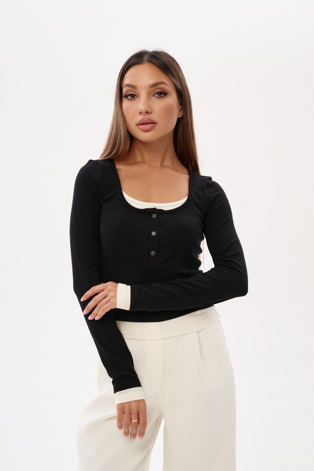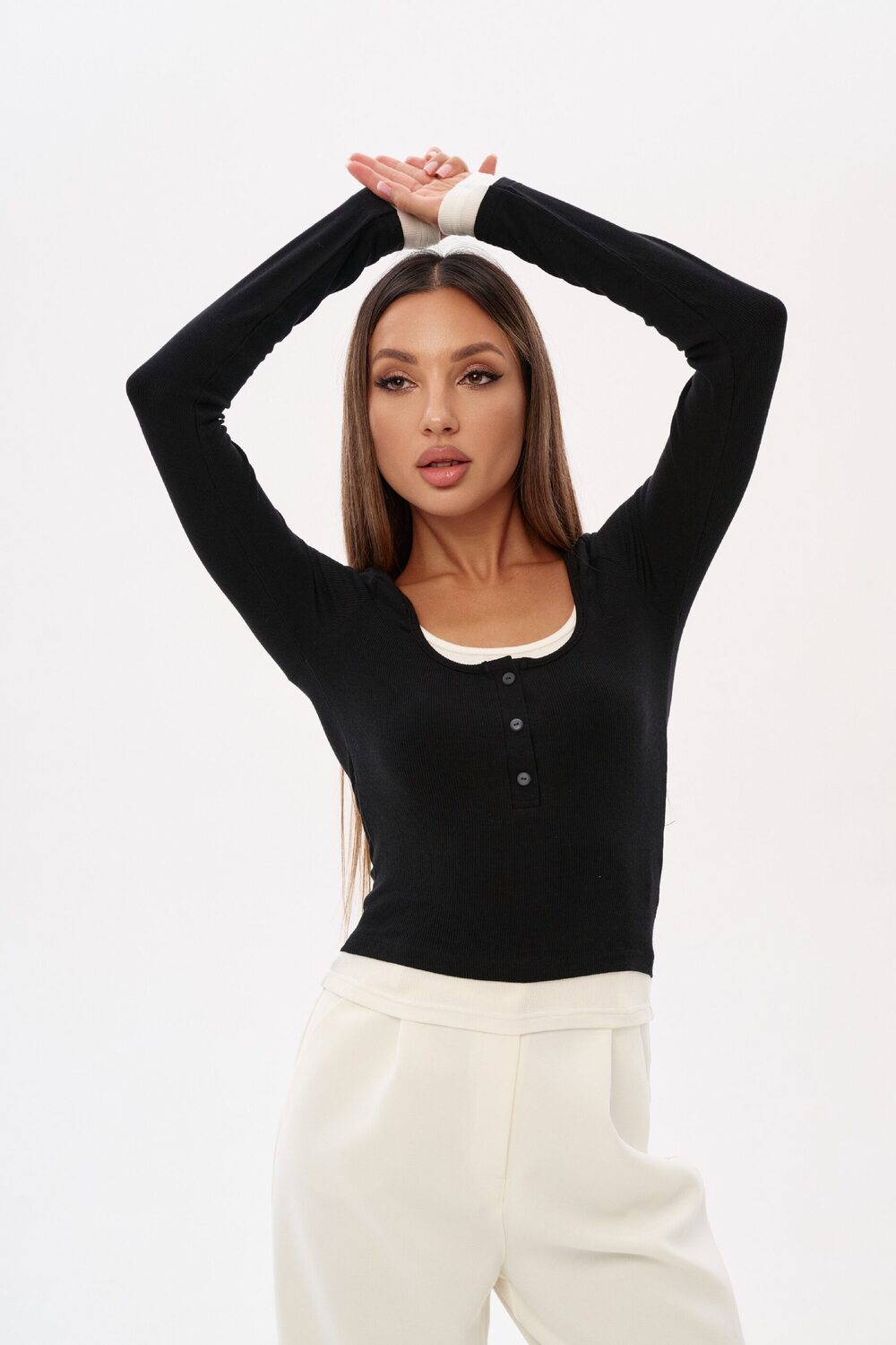 Лонгслив с контрастными вставками и пуговицами на лифе - создает эффект надетой под него водолазки. Плотная эластичная трикотажная ткань держит форму и мягко облегает фигуру, не сковывая движений. Позволяет выглядеть продуманно без лишних слоёв - идеально для тех, кто ценит лаконичность с изюминкой.