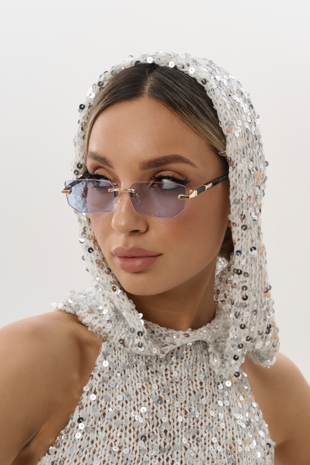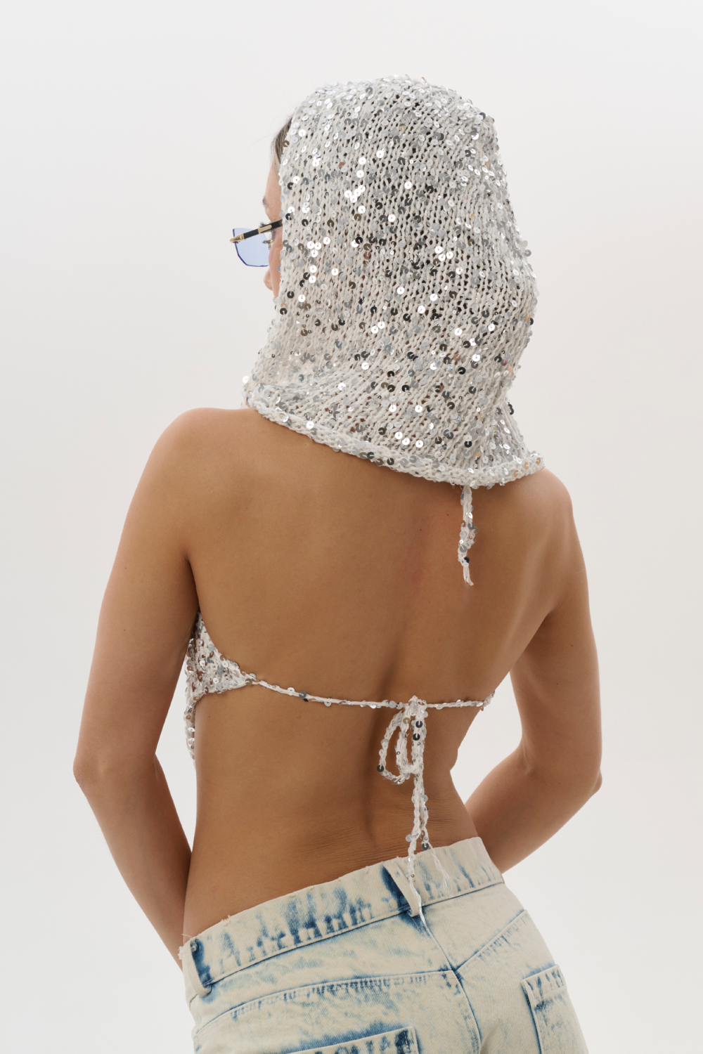 Топ ручной вязки с пайетками для самых эффектных выходов. Спереди форма ромба, сзади - открытая спина и завязки. А капюшон добавляет настроения образу.