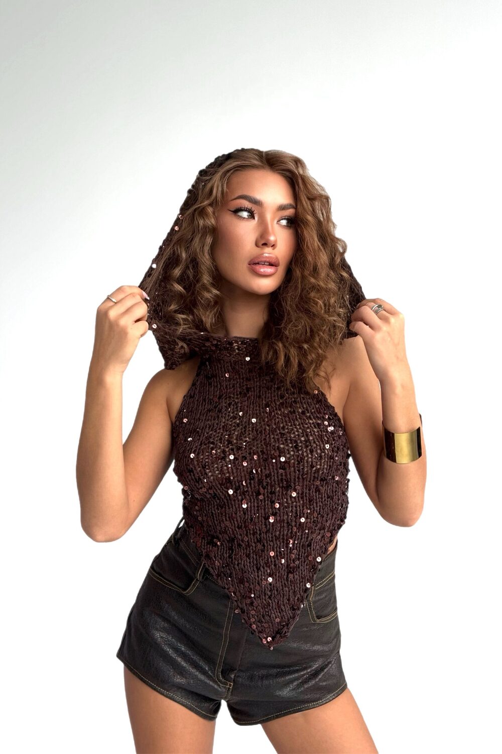 Топ ручной вязки с пайетками для самых эффектных выходов. Спереди форма ромба, сзади - открытая спина и завязки. А капюшон добавляет настроения образу.