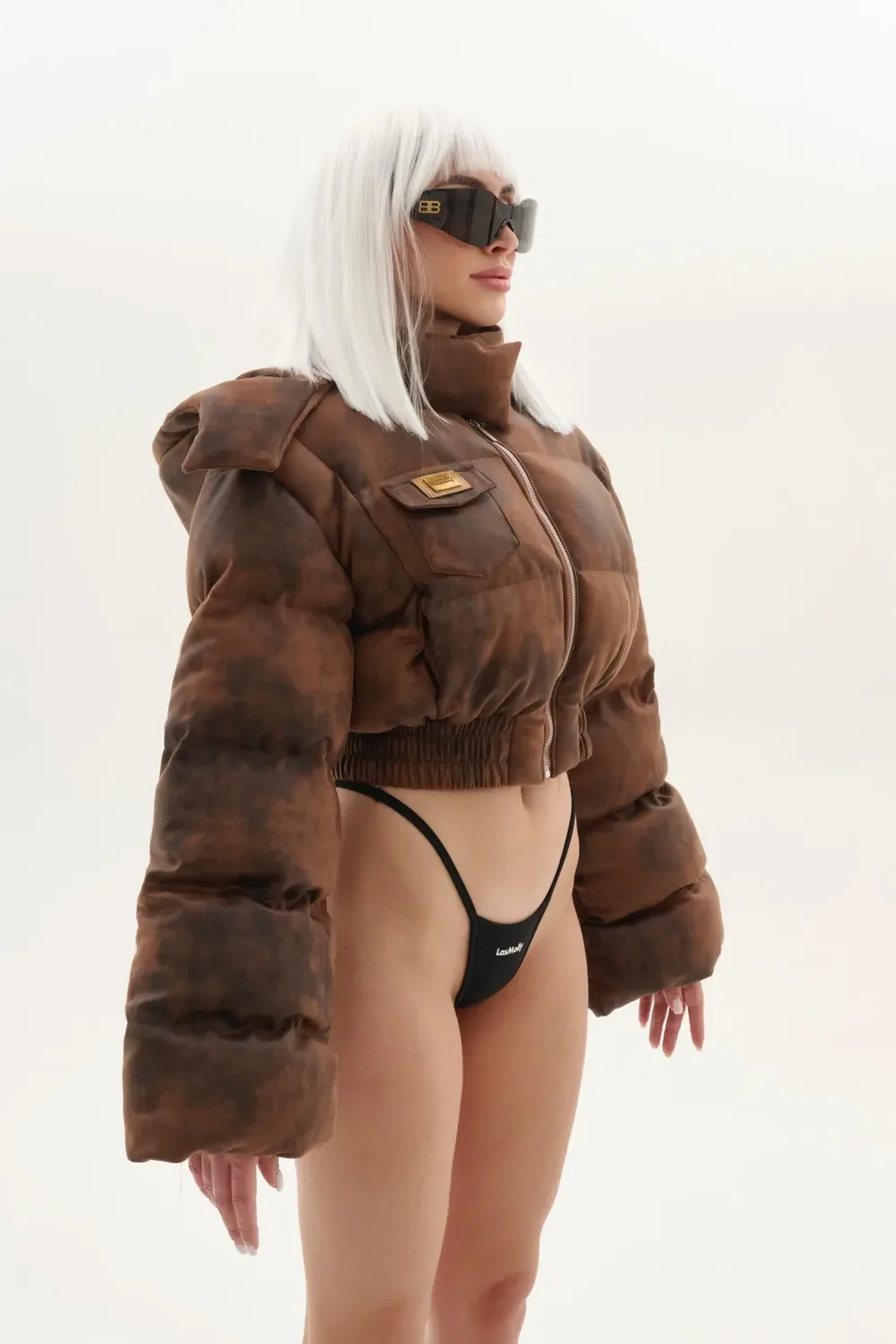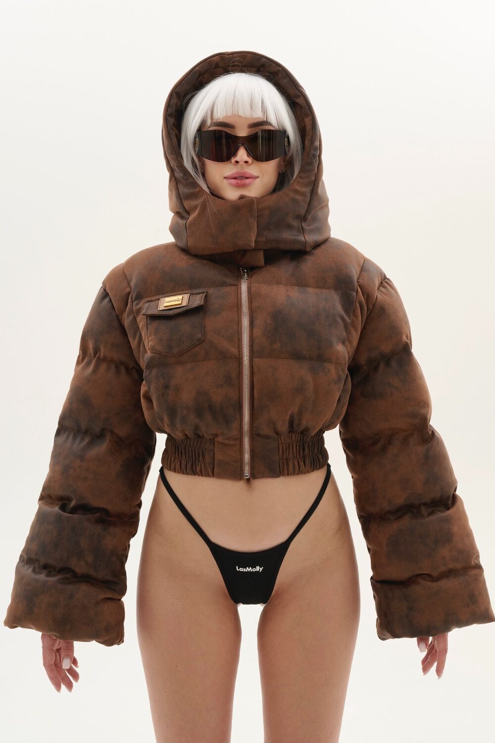 Объемная укороченная куртка с капюшоном и расклешенными рукавами из лимитированной коллекции с уникальным принтом - воплощение уличной элегантности, где объемный силуэт становится знаком статуса. Высококачественный наполнитель обеспечивает тепло без лишнего веса, оставляя движения свободными. Идеальна для тех, кто хочет выделяться из толпы.