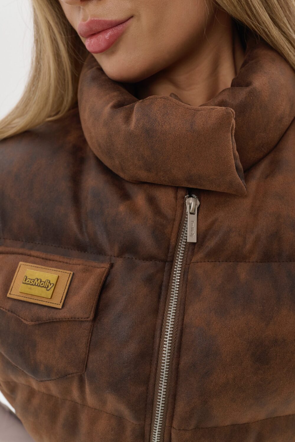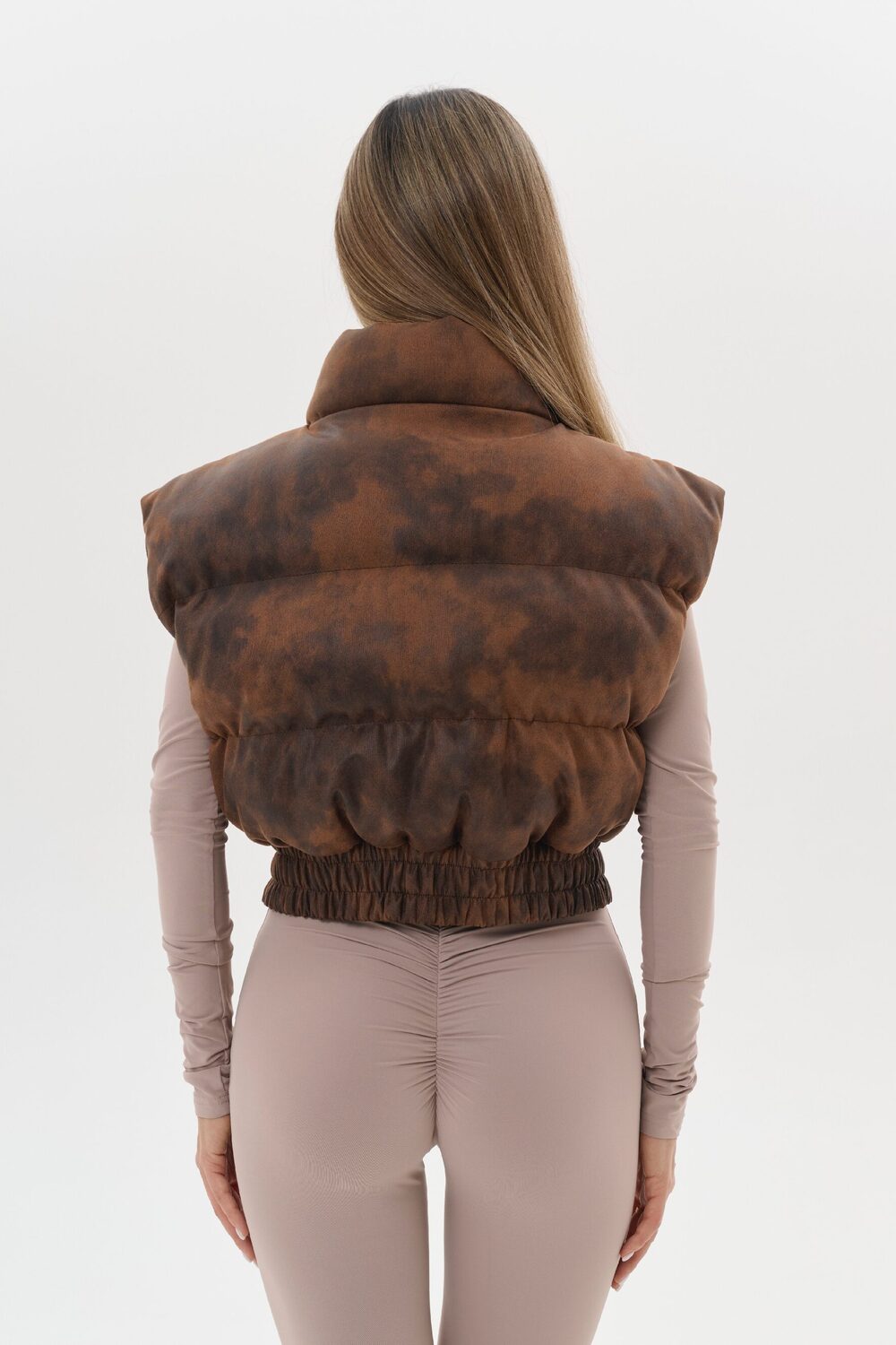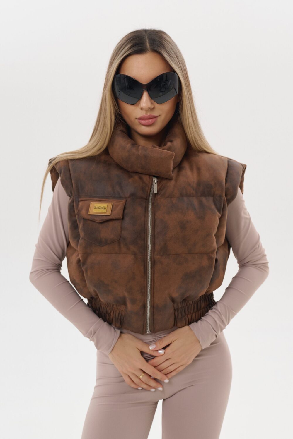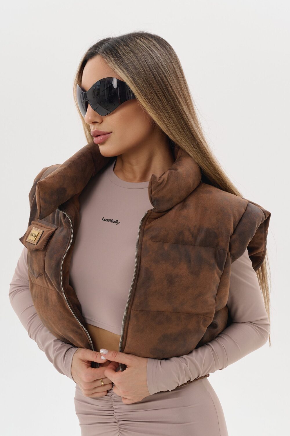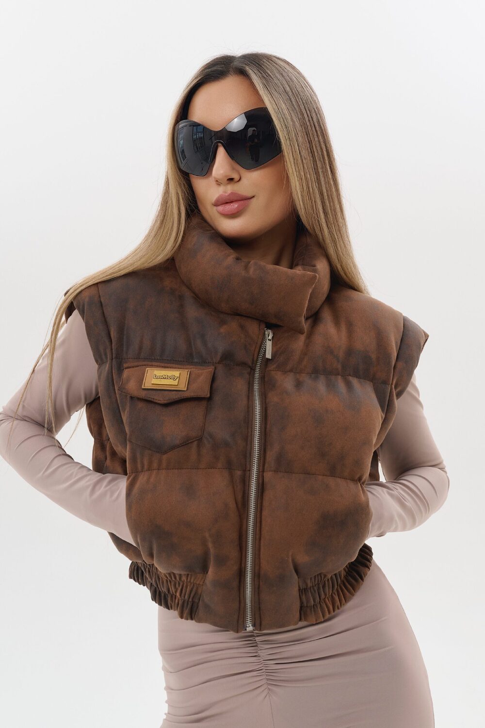 Укороченная жилетка из лимитированной коллекции. Премиальная ткань с эффектом замши создаёт эффектный акцент в образе.